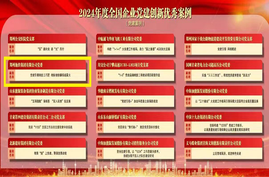 近日,2024全國(guó)企業(yè)黨建(案例)研討會(huì)暨第四屆企業(yè)黨建創(chuàng)新優(yōu)秀案例發(fā)布儀式在北京成功舉辦。鄭州地鐵集團(tuán)有限公司黨委黨建品牌案例《黨建引領(lǐng)育能工巧匠 精檢細(xì)修耀綠城星火》成功入選“2024年度全國(guó)企業(yè)黨建創(chuàng)新優(yōu)秀案例”,黨建品牌“綠城星火”在全國(guó)企業(yè)黨建工作中再獲殊榮。